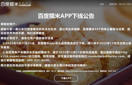 1.2022年8月31日24點(diǎn),百度糯米app將從應(yīng)用商店進(jìn)行下架,預(yù)計(jì)將于2022年12月正式停止相關(guān)服務(wù);