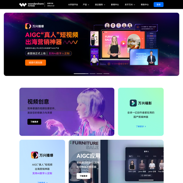 AIGC軟件A股上市公司萬(wàn)興科技(300624.SZ),全球領(lǐng)先的新生代數(shù)字創(chuàng)意賦能者,致力于成為全世界范圍內(nèi)有特色、有影響力的百年軟件老店。