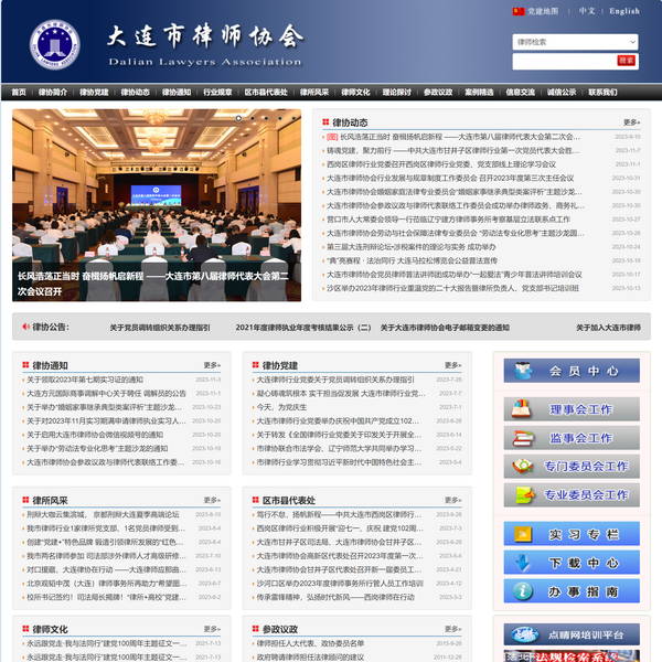 大連市律師協(xié)會是依法成立的社會團體法人,是大連市律師的自律性行業(yè)組織,依據(jù)《律師法》、《律師協(xié)會章程》,對大連市執(zhí)業(yè)律師實行行業(yè)管理,受大連市司法局的監(jiān)督和指導。協(xié)會現(xiàn)有團體會員392家,律師會員5421人。近年來,協(xié)會先后榮獲“全國先進社會組織”、“遼寧省示范社團”、“大連市5A級社會團體”等榮譽稱號。協(xié)會黨委先后榮獲“遼寧省基層黨建工作先進單位”、“民政部社會組織深入學習實踐科學發(fā)展觀活動先進單位”等榮譽稱號。