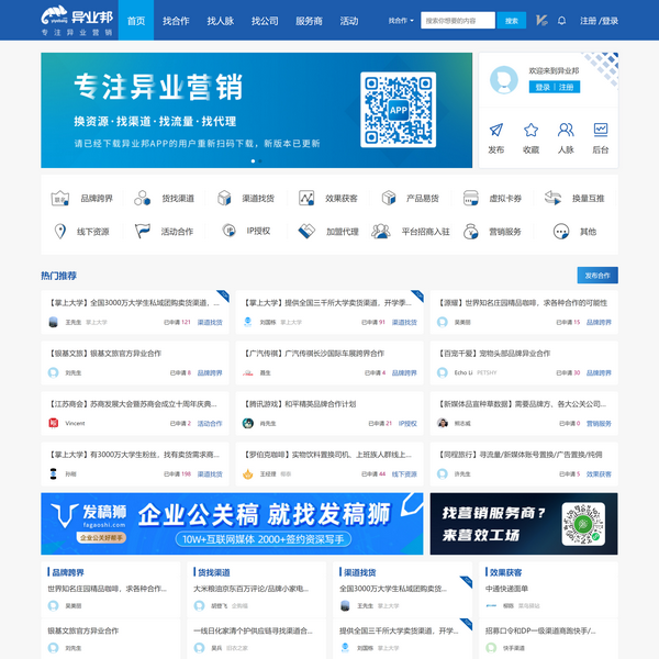 異業(yè)邦成立于2015年,是國(guó)內(nèi)創(chuàng)新型異業(yè)合作跨界營(yíng)銷的商務(wù)對(duì)接平臺(tái)。幫助企業(yè)用營(yíng)銷資源置換方式,實(shí)現(xiàn)高效市場(chǎng)合作。找渠道、找流量、找代理、換資源,實(shí)現(xiàn)銷售變現(xiàn)。平臺(tái)已鏈接超過(guò)50萬(wàn)家品牌、渠道和流量供應(yīng)商資源。