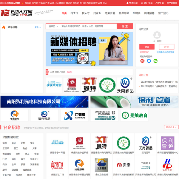 南陽(yáng)人才網(wǎng)(E動(dòng)人才網(wǎng))是南陽(yáng)地區(qū)的專(zhuān)業(yè)招聘網(wǎng)站、南陽(yáng)求職招聘的理想選擇,每月舉辦招聘會(huì)!南陽(yáng)找工作,查詢南陽(yáng)招聘網(wǎng)企業(yè)***信息,就上E動(dòng)人才網(wǎng)。