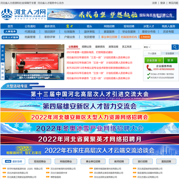 河北人才網(wǎng)是河北省人才市場***官方網(wǎng)站,由河北省人社廳主管,提供權威的河北人才招聘信息,事業(yè)單位招聘信息,人事代理等服務,并設石家莊人才網(wǎng),京津冀人才網(wǎng)等頻道。