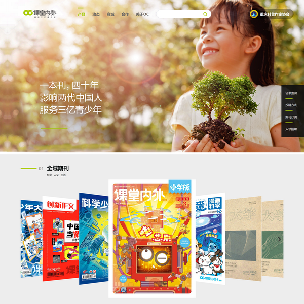 課堂內(nèi)外是重慶市委宣傳部主管的國有企業(yè),中國著名的青少年教育服務(wù)集團,以“服務(wù)三億青少年”為使命,倡導(dǎo)“科學(xué)、人文、生活”的教育理念。曾先后榮獲“全國科普教育基地”“全國數(shù)字出版轉(zhuǎn)型示范單位”“中國郵政發(fā)行報刊百強”“全國百強報刊”“全國優(yōu)秀少兒報刊” “中國優(yōu)秀科普期刊”及“全國科普工作先進集體”等榮譽。