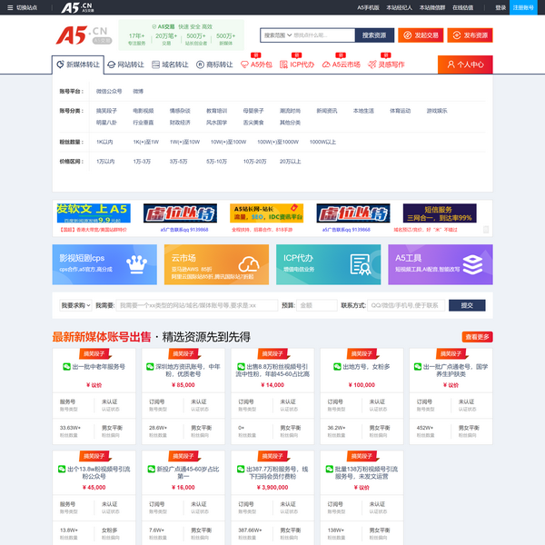 A5交易(www.a5.net),互聯(lián)網(wǎng)資源交易平臺,提供域名網(wǎng)站、新媒體、商標、網(wǎng)店等交易服務。