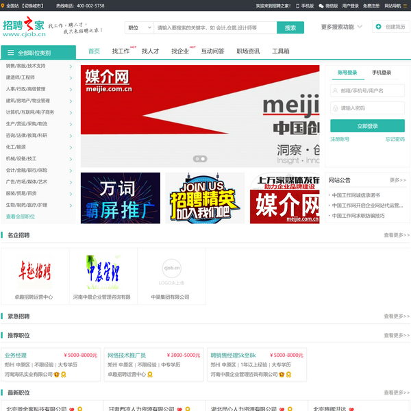 招聘之家(cjob.cn)成立于2005年,是一家專業(yè)的求職,招聘,就業(yè),找工作,人才網(wǎng)站,提供企業(yè)招聘信息,求職簡(jiǎn)歷信息,人才市場(chǎng)招聘會(huì)信息發(fā)布,找靠譜好工作就上招聘之家。