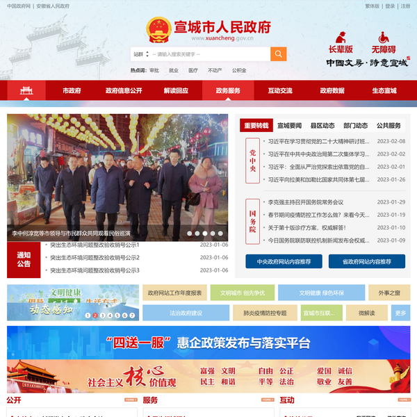 宣城市人民政府網(wǎng)站是由宣城市人民政府辦公室主辦、宣城市政府政務(wù)新媒體中心承辦的市政府門戶網(wǎng)站。是宣城市政府信息公開和宣傳宣城的重要窗口,是政務(wù)服務(wù)的重要平臺(tái),是政府聯(lián)系公眾和企業(yè)的橋梁。 宣城市政府網(wǎng)站及時(shí)發(fā)布、更新各類政務(wù)信息,提供網(wǎng)上辦事服務(wù)和便民服務(wù)查詢,方便社會(huì)公眾參政議政、投訴建議和互動(dòng)交流