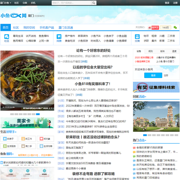 廈門小魚網(wǎng)是廈門***的城市生活門戶,前身是廈門小魚社區(qū).廈門小魚網(wǎng)以提倡網(wǎng)友們互幫互助為社區(qū)發(fā)展宗旨,廈門小魚社區(qū)“關(guān)愛、分享、互助、交流”的網(wǎng)絡(luò)精神影響著廈門年輕一代的網(wǎng)民.
