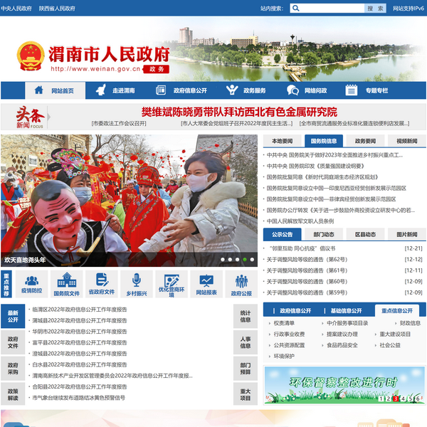 渭南市人民政府網(wǎng)站(http://www.weinan.gov.cn)是渭南市人民政府官方門戶網(wǎng)站,設(shè)置有走進渭南、信息公開、民生服務(wù)、網(wǎng)上辦事、互動交流等10個頻道。全面公開渭南各類政府信息,為群眾提供教育、醫(yī)療、社保、住房、交通等辦事指南及信息查詢,提供政民互動渠道,解答群眾疑問,建設(shè)富有本地特色的專題專欄,同時開通政務(wù)微博、微信及手機客戶端,全方位展示渭南政務(wù)工作、本地特色,弘揚時代主旋律。