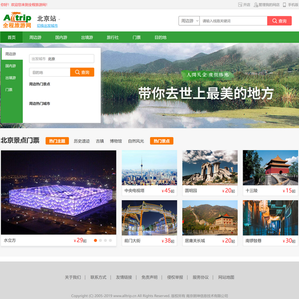 作為一站式旅游預(yù)訂網(wǎng)站,全程旅游網(wǎng)提供旅游線路、旅游團(tuán)、酒店、景點(diǎn)門票、簽證、導(dǎo)游等的旅游預(yù)訂服務(wù),并對旅游目的地進(jìn)行深度介紹??鞓仿糜危瑥娜叹W(wǎng)開始!