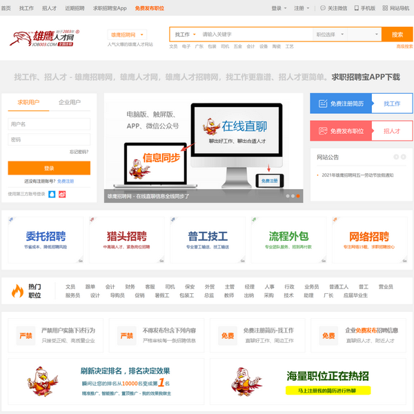 雄鷹招聘網(wǎng)-雄鷹人才網(wǎng)(JOB003.COM),覆蓋全國(guó)200多個(gè)城市,為求職者提供準(zhǔn)確靠譜的招工***招聘信息,求職招聘寶APP為企業(yè)提供人才招聘、集網(wǎng)絡(luò)招聘、委托招聘、招聘會(huì)等多渠道為一體的專業(yè)人才招聘網(wǎng)站。