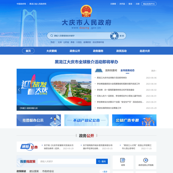 “中國·大慶”--大慶市人民政府門戶網站的主要任務是:發(fā)布政務信息、反映社情民意、提供網上政府服務和政務監(jiān)督渠道。
