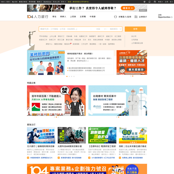 臺(tái)灣”。104人力銀行網(wǎng)站信息查詢,網(wǎng)址鏈接:https://www.104.com.tw/;備案編號(hào):;站點(diǎn)標(biāo)簽:徵才,打工,履歷,自傳,找工作,求職網(wǎng),人力銀行" />