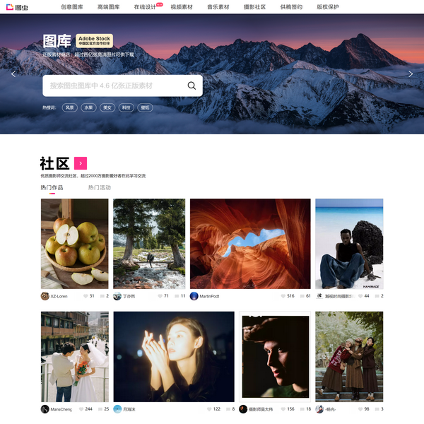 圖蟲(chóng)成立于2009年,旗下?lián)碛袌D蟲(chóng)社區(qū)、圖蟲(chóng)創(chuàng)意、圖蟲(chóng)Premium三個(gè)產(chǎn)品業(yè)務(wù)。作為影像傳播平臺(tái),圖蟲(chóng)社區(qū)目前已有2000萬(wàn)注冊(cè)用戶(hù),每天有來(lái)自全球各地的攝影創(chuàng)作者在圖蟲(chóng)發(fā)布攝影、視頻作品。作為版權(quán)素材交易平臺(tái)(圖蟲(chóng)創(chuàng)意和圖蟲(chóng)Premium),圖蟲(chóng)代理全球超過(guò)300家資源方的視覺(jué)版權(quán)資源,滿(mǎn)足各類(lèi)場(chǎng)景視覺(jué)營(yíng)銷(xiāo)需求。2020年6月,圖蟲(chóng)成為Adobe Stock在中國(guó)的官方合作伙伴,讓視覺(jué)版權(quán)資源更具國(guó)際化和多元化。
