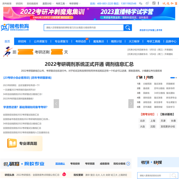 跨考教育成立十?dāng)?shù)年,以個(gè)性化考研輔導(dǎo)為特色,為考生量身定制考研輔導(dǎo)培訓(xùn)體系,是考研學(xué)子心中跨??鐚?nbsp; 業(yè)考研輔導(dǎo)培訓(xùn)的擇優(yōu)之選。實(shí)時(shí)更新考研時(shí)間,考研大綱,考研復(fù)試分?jǐn)?shù)線、考研真題解讀等考研信息。