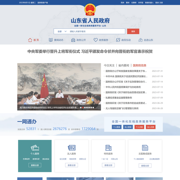 “山東省政府網(wǎng)”現(xiàn)已開通“首頁、要聞動態(tài)、政務(wù)公開、政務(wù)服務(wù)、政民互動、走進山東”六大頻道。網(wǎng)站按照全面推進“互聯(lián)網(wǎng)+政務(wù)服務(wù)”的總體要求,力求更好地反映政府工作、更好地傾聽百姓呼聲、更好地方便群眾辦事,展現(xiàn)職能科學、結(jié)構(gòu)優(yōu)化、廉潔高效、人民滿意服務(wù)型政府的建設(shè)成果。