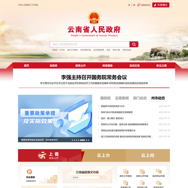 云南省人民政府門戶網(wǎng)站提供網(wǎng)站重要信息公開欄目、網(wǎng)上辦事服務(wù)事項、投訴建議和互動交流入口。