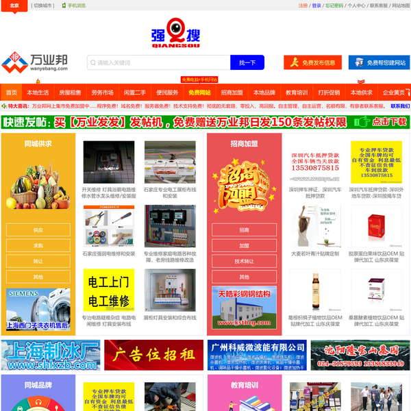 萬業(yè)邦是面向地區(qū)的分類信息免費發(fā)布平臺,內(nèi)容主要包括母嬰專欄、房屋租賃、招聘求職、庫存二手、勞務(wù)市場、招商加盟、教育培訓(xùn)、促銷打折,免費建設(shè)網(wǎng)站等,歡迎關(guān)注萬業(yè)邦免費發(fā)布信息網(wǎng)站!