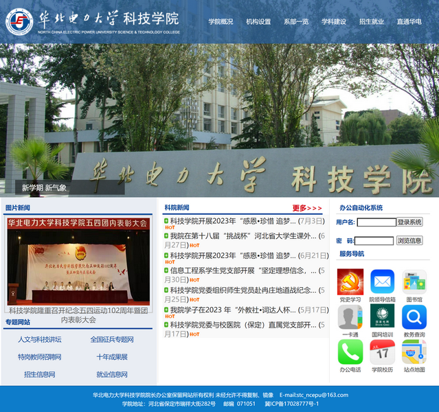 華北電力大學科技學院成立于2002年6月,是國家教育部和河北省人民政府批準設立,由國家"211工程"重點建設高校華北電力大學與河北省電力公司按新機制、新模式合作舉辦的全日制本科層次的獨立學院。2004年經過國家教育部專家組評估為合格辦學單位。華北電力大學科技學院坐落于歷史文化古城保定。保定市位于河北省中部,南距河北省省會石家莊125公里,北距北京141公里,東距天津155公里,地處"京、津、石三角"中部;總面積達2萬多平方公里(市區(qū)面積312.3平方公里),人口達一千多萬(市區(qū)人口八十多萬人),轄3個區(qū)、4個縣級市、18個縣。