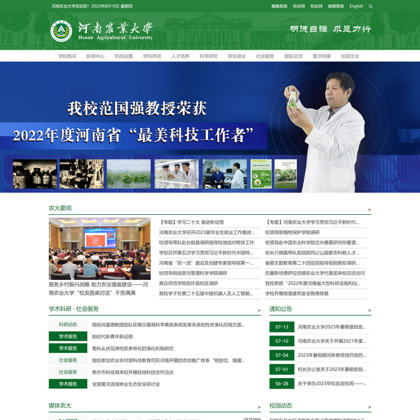 學校建有鄭州文化路校區(qū)、龍子湖校區(qū)和許昌校區(qū),占地面積264.83萬㎡。建有兩地三校區(qū)互聯、全方位覆蓋的信息網絡環(huán)境,以及數字化校園綜合應用信息共享平臺。設有農、工、理、經、管、法、文、醫(yī)、教、藝10大學科門類。擁有1個一級學科國家重點學科,19個省部級重點學科,7個博士后科研流動站;10個博士學位授權一級學科,1個博士專業(yè)學位類別;18個碩士學位授權一級學科,17個碩士專業(yè)學位類別;88個本科專業(yè)。各類在校生33319人。學校在職教職員工2517人。其中教授、副教授等高級專業(yè)技術職務1002人,博士學位1311人。中國工程院院士1人,各級各類人才123人。先后獲評河南省“三全育人”綜合改革試點建設高校、全國就業(yè)50強高校、全國創(chuàng)新創(chuàng)業(yè)50強高校、全國鄉(xiāng)村振興人才培養(yǎng)優(yōu)質高校、全國糧食安全宣傳教育基地等。