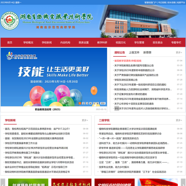 湖南生物機(jī)電職業(yè)技術(shù)學(xué)院是一所具有百余年辦學(xué)歷史的全日制公辦普通高等院校,入選國家首批“雙高計(jì)劃”建設(shè)高水平專業(yè)群C檔、全國鄉(xiāng)村振興人才培養(yǎng)優(yōu)質(zhì)校、湖南省“雙高計(jì)劃”建設(shè)學(xué)校A檔、湖南示范性高職學(xué)院和湖南省卓越高職學(xué)院。世界著名雜交水稻專家袁隆平院士曾任學(xué)院名譽(yù)院長。