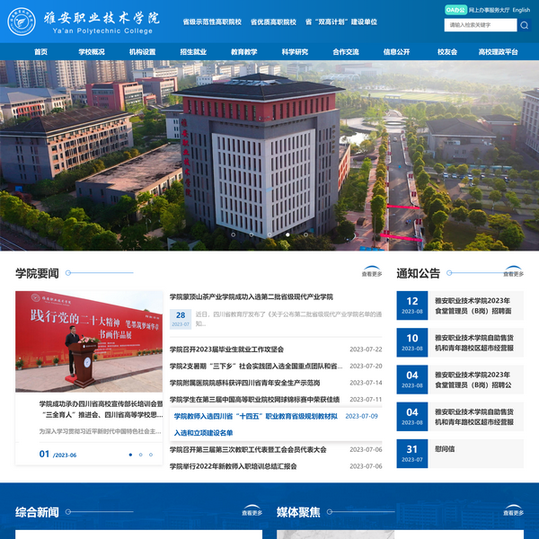雅安職業(yè)技術(shù)學(xué)院坐落在被譽(yù)為“天府之肺 熊貓故鄉(xiāng)”“川西咽喉”“西藏門戶”“民族走廊”的雅安市,學(xué)校有著70余年的辦學(xué)底蘊(yùn),厚積了豐富的辦學(xué)資源、辦學(xué)經(jīng)驗(yàn)和較強(qiáng)的辦學(xué)實(shí)力,是省“雙高計(jì)劃”建設(shè)單位、省優(yōu)質(zhì)高職院校、省級(jí)示范性高職院校。