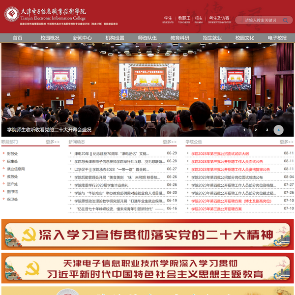 天津電子信息職業(yè)技術(shù)學(xué)院始建于1953年,學(xué)院伴隨著共和國成長,堅定社會主義辦學(xué)方向,為黨和國家事業(yè)培養(yǎng)了一大批德智體美勞全面發(fā)展的社會主義建設(shè)者和接班人。進(jìn)入新時代,學(xué)校致力于打造具有中國特色、世界水平的高職院校,秉承“據(jù)于德、游于藝”的校訓(xùn)精神,以立德樹人為根本任務(wù),培養(yǎng)更多高素質(zhì)技術(shù)技能人才、能工巧匠、大國工匠,聚焦服務(wù)“新基建”國家戰(zhàn)略及信息技術(shù)應(yīng)用創(chuàng)新(信創(chuàng))產(chǎn)業(yè)發(fā)展,主動融入天津市“一基地三區(qū)”建設(shè),為全面建設(shè)社會主義現(xiàn)代化國家提供有力人才和技能支撐。