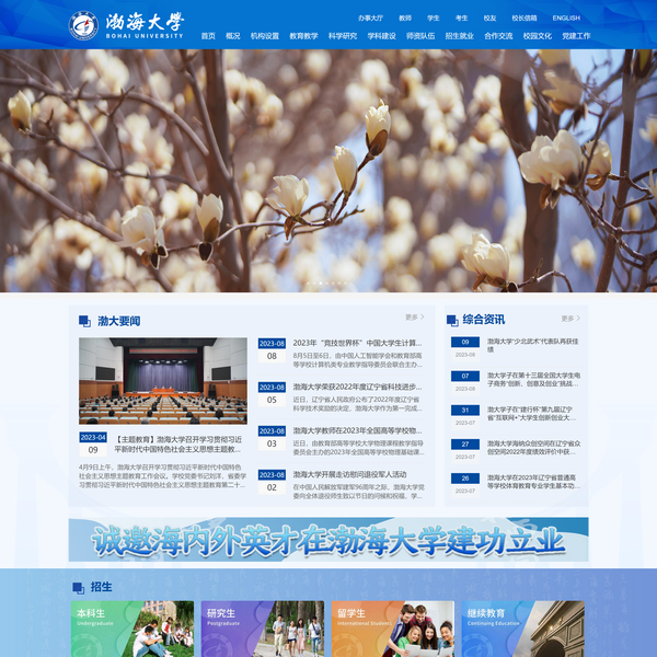 渤海大學(xué)始建于1950年2月,是遼寧省政府主辦的綜合性大學(xué),位于渤海之濱的歷史文化名城遼寧省錦州市。學(xué)校為具有推薦優(yōu)秀應(yīng)屆本科畢業(yè)生免試攻讀碩士研究生資格院校和中國(guó)政府獎(jiǎng)學(xué)金來(lái)華留學(xué)生培養(yǎng)院校。