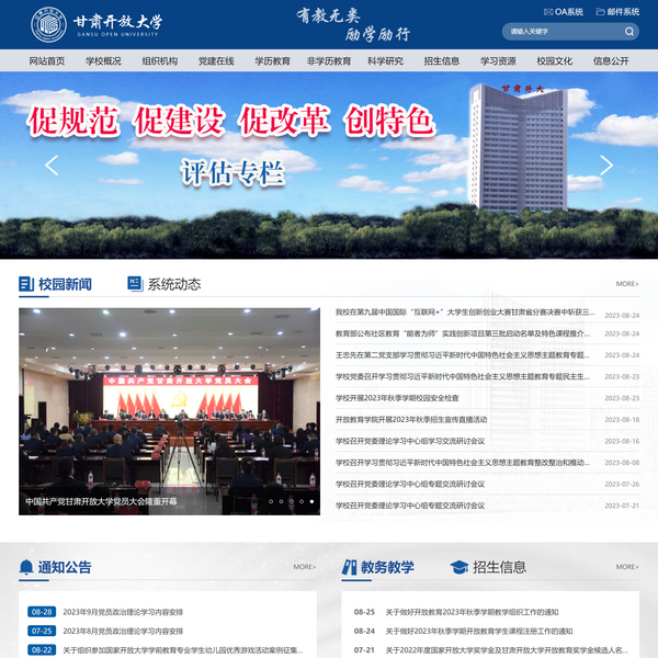 甘肅開(kāi)放大學(xué)是由甘肅省人民政府舉辦,甘肅省教育廳管理的新型高等學(xué)校,業(yè)務(wù)上接受國(guó)家開(kāi)放大學(xué)指導(dǎo),是國(guó)家開(kāi)放大學(xué)辦學(xué)體系的重要組成部分。學(xué)校以現(xiàn)代信息技術(shù)為支撐,面向全體社會(huì)成員提供多樣化、多層次的學(xué)歷教育和非學(xué)歷教育,滿足學(xué)習(xí)者多元、靈活、個(gè)性的繼續(xù)教育和終身學(xué)習(xí)需求,服務(wù)于甘肅學(xué)習(xí)型社會(huì)建設(shè)。