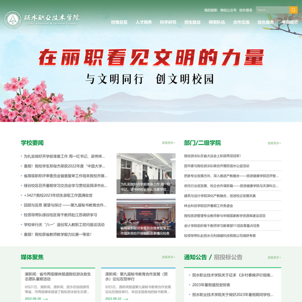 麗水職業(yè)技術學院是一所歷史悠久、底蘊深厚的全日制綜合性高職院校,前身是1910年處州知府蕭文昭創(chuàng)辦的處州種植學堂,2000年12月,由原浙江林業(yè)學校和浙江麗水商業(yè)學校合并升格組建而成?,F(xiàn)為浙江省示范性高職院校、浙江省文明單位、全國綠化模范單位、浙江省數(shù)字校園示范學校。2020年成功入選浙江省高水平職業(yè)院校建設單位,林業(yè)技術、會計兩個專業(yè)群入選浙江省高水平建設專業(yè)群(A類)。
