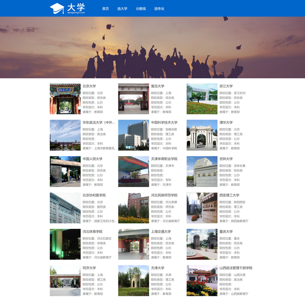 中國大學(xué)排名查詢,高考志愿填報(bào)指南,全國985高校、211大學(xué)排名,全國大學(xué)歷年招生情況,國內(nèi)大學(xué)信息查詢,專業(yè)介紹,歷年錄取分?jǐn)?shù)查詢。