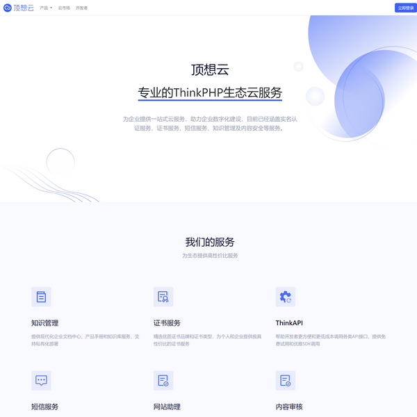 頂想云:專業(yè)的ThinkPHP生態(tài)云服務(wù)。為企業(yè)提供一站式云服務(wù),助力企業(yè)數(shù)字化建設(shè),目前已經(jīng)涵蓋實名認證服務(wù)、證書服務(wù)、短信服務(wù)、知識管理及內(nèi)容安全等服務(wù)。