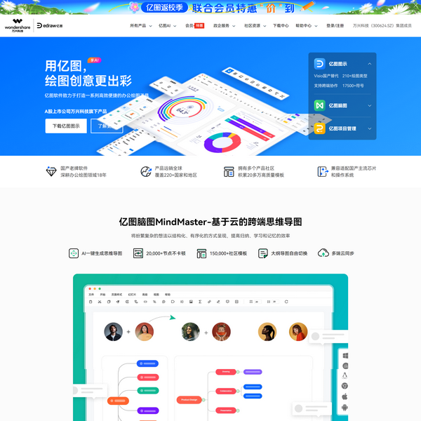 億圖:A股上市公司萬興科技旗下億圖軟件可讓您輕松繪制流程圖,思維導(dǎo)圖,信息圖,組織架構(gòu)圖,網(wǎng)絡(luò)拓?fù)鋱D,戶型圖,電路圖等210種繪圖類型。上萬模板免費下載,一定程度可替代Visio。廣泛應(yīng)用于辦公教育領(lǐng)域。