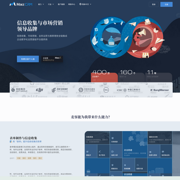 麥客CRM是集在線表單問卷制作、信息收集與數(shù)據(jù)分析、客戶關(guān)系管理、郵件短信群發(fā)于一體的企業(yè)數(shù)字化運營平臺。幫助企業(yè)客戶搭建人員管理/會員分銷/網(wǎng)上商城/預約平臺等專屬系統(tǒng),輕松完成自動獲客、用戶調(diào)查、數(shù)據(jù)分析、服務運營、市場營銷和效益增長。適用于報名/登記/簽約/售票/抽獎等海量業(yè)務場景,助力用戶成功。