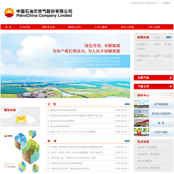 中國石油是中國主要的油氣生產(chǎn)和銷售商之一,也是全球油氣行業(yè)的重要參與者。公司廣泛從事與石油、天然氣、新能源有關(guān)的業(yè)務(wù),為經(jīng)濟(jì)和社會發(fā)展持續(xù)提供能源和石油制品,并致力于構(gòu)建能源與環(huán)境、社會的和諧。