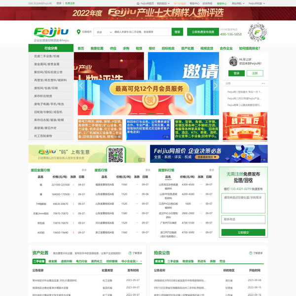 廢舊網(wǎng)(Feijiu網(wǎng))是專業(yè)從事廢舊物資回收,二手處理的平臺(tái),廢舊網(wǎng)為您精選二手設(shè)備,廢金屬,廢紙,廢橡膠,紡織廢料,廢電子電器,廢銅,廢鋁,廢鐵的資產(chǎn)處置、拍賣招標(biāo)、行情報(bào)價(jià)等轉(zhuǎn)讓回收價(jià)格信息。