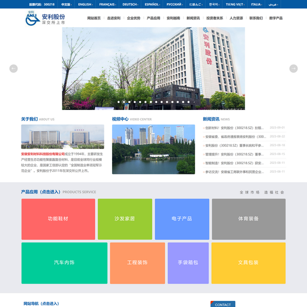 安徽安利材料科技股份有限公司成立于1994年,地處安徽省合肥經濟技術開發(fā)區(qū)桃花工業(yè)園,主要生產經營生態(tài)功能性聚氨酯合成革和聚氨酯復合材料,下有合肥安利聚氨酯新材料有限公司、安利越南公司、安利俄羅斯公司三家控股子公司。