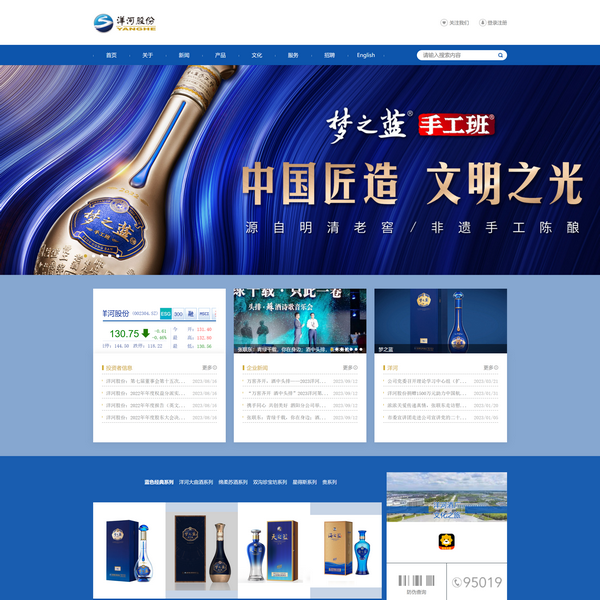 江蘇洋河酒廠股份有限公司,位于中國白酒之都——江蘇省宿遷市,總占地面積10平方公里,總資產(chǎn)605.62億元,員工3萬人,下轄洋河、雙溝、泗陽、貴酒、梨花村五大釀酒生產(chǎn)基地和蘇酒集團貿(mào)易股份有限公司,是行業(yè)內擁有兩大“中國名酒”、兩個“中華老字號”、六枚中國馳名商標、兩個國家4A級景區(qū)、兩處國家工業(yè)遺產(chǎn)和一個全國重點文物保護單位的企業(yè)。公司坐擁“三河兩湖一濕地”,所在地宿遷與法國干邑白蘭地產(chǎn)區(qū)、英國蘇格蘭威士忌產(chǎn)區(qū)并稱“世界三大濕地名酒產(chǎn)區(qū)”。