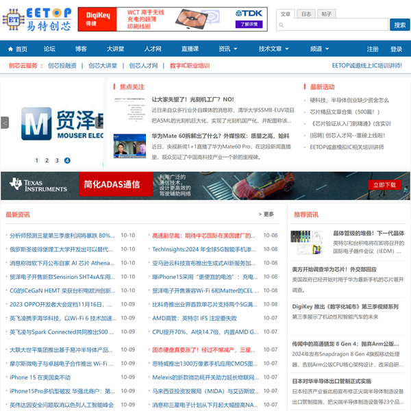 EETOP-創(chuàng)芯網(wǎng)(原:中國(guó)電子***開(kāi)發(fā)網(wǎng))是一家專為中國(guó)電子工程師、芯片工程師和電子設(shè)計(jì)主管提供半導(dǎo)體電子技術(shù)開(kāi)發(fā)應(yīng)用資訊的網(wǎng)絡(luò)傳媒。其內(nèi)容服務(wù)核心是快速傳播半導(dǎo)體集成電路領(lǐng)域的***技術(shù)產(chǎn)品,新聞資訊,電子技術(shù)應(yīng)用知識(shí),提供電子工程師和設(shè)計(jì)主管所需要的各種工具資料。頻道包括:半導(dǎo)體,集成電路,FPGA,可編程邏輯,汽車電子,通訊,手機(jī),物聯(lián)網(wǎng),機(jī)器人,人工智能,數(shù)字電視,網(wǎng)絡(luò)通信,工業(yè)控制,測(cè)試測(cè)量,安防電子,醫(yī)療電子,單片機(jī),嵌入式,模擬電子,電源管理,RF無(wú)線,傳感技術(shù),MEMS。