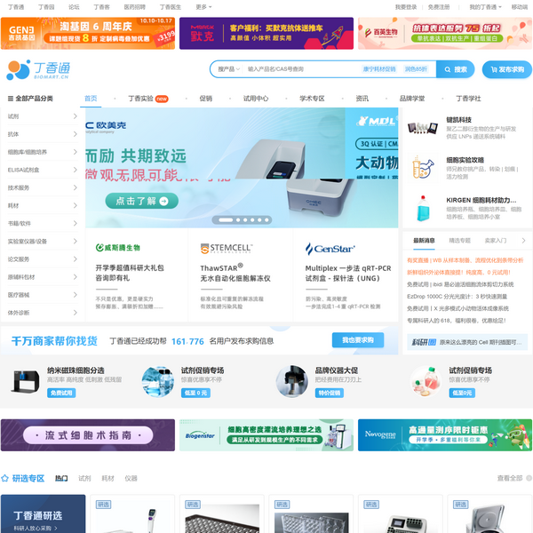 丁香通依托于丁香園 550 多萬會員,以及 3 萬多家注冊企業(yè),致力于為臨床和科研用戶提供實(shí)驗(yàn)室用品、課題服務(wù)等咨詢和采購交流信息平臺。為生物醫(yī)藥企業(yè)提供產(chǎn)品展示、品牌建設(shè)、招商代理、大數(shù)據(jù)分析、行業(yè)調(diào)研以及市場活動運(yùn)營外包等營銷和咨詢服務(wù)。