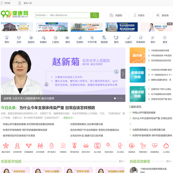 99健康網(wǎng)是一家專業(yè)提供健康資訊的綜合性健康網(wǎng),是最適合中國人的健康門戶網(wǎng)站。99健康網(wǎng)站旗下設有醫(yī)院庫、藥品庫、男科、婦科、中醫(yī)、老人、育兒、體檢、圖庫、美容、整形、減肥、健身、心理、飲食、保健、疾病等頻道。是醫(yī)療保健類網(wǎng)站杰出代表,歡迎廣大網(wǎng)友加入我們的99健康論壇一起交流健康養(yǎng)生之道。
