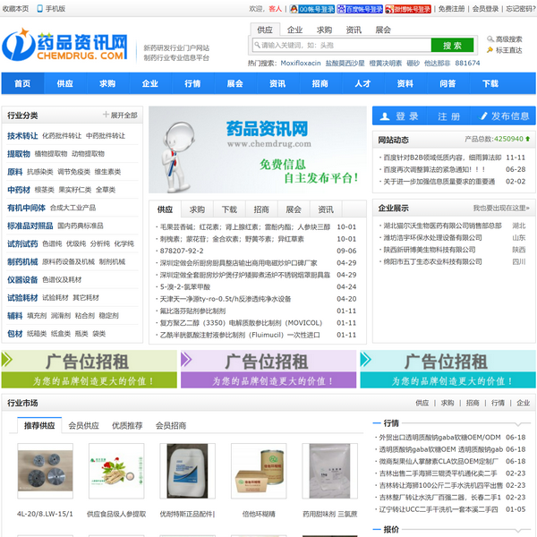 集醫(yī)藥招商(藥品招商)、醫(yī)藥中間體、儀器設備、藥包材、藥輔料、制藥機械、試劑試藥等信息發(fā)布及醫(yī)藥文獻、藥品標準、藥物合成數(shù)據(jù)等醫(yī)藥信息檢索為一體的醫(yī)藥網(wǎng)站。