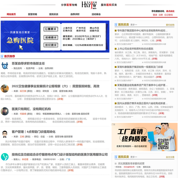 華夏醫(yī)界網(wǎng)(原海峽醫(yī)界網(wǎng)),為中國(guó)民營(yíng)醫(yī)院提供全面、詳細(xì)的醫(yī)療信息服務(wù)。包括醫(yī)療資訊,民營(yíng)醫(yī)院營(yíng)銷,民營(yíng)醫(yī)院管理,醫(yī)療廣告,醫(yī)療人才,醫(yī)院合作轉(zhuǎn)讓,醫(yī)院營(yíng)銷培訓(xùn),醫(yī)院管理培訓(xùn)。
