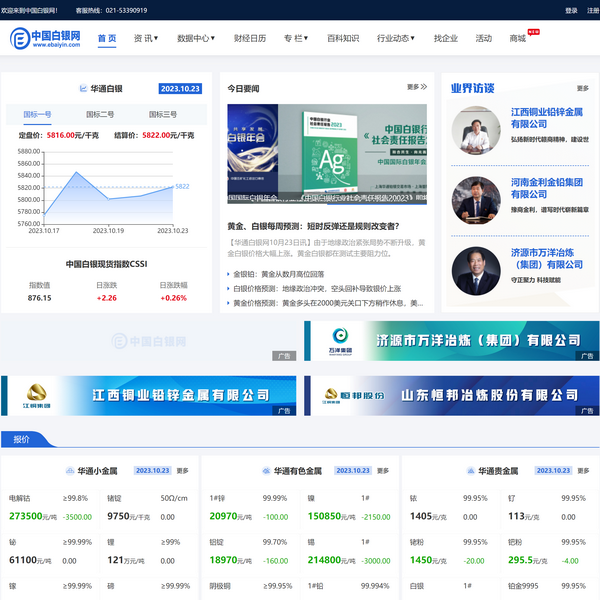 2003年4月23日,華通白銀網(wǎng)上線,是白銀行業(yè)專業(yè)門戶網(wǎng)站,是國(guó)內(nèi)以實(shí)物白銀現(xiàn)貨交收為依托的交易市場(chǎng)信息發(fā)布平臺(tái)。通過華通白銀網(wǎng)每日發(fā)布的白銀現(xiàn)貨“定盤價(jià)”和“結(jié)算平均價(jià)”是華通白銀現(xiàn)貨流通領(lǐng)域具有影響力的報(bào)價(jià),被白銀生產(chǎn)、貿(mào)易和采購(gòu)企業(yè)廣泛用作定價(jià)依據(jù)。每日發(fā)布的定盤價(jià)和結(jié)算平均價(jià)是國(guó)內(nèi)白銀現(xiàn)貨的指導(dǎo)價(jià)和價(jià)格風(fēng)向標(biāo)。