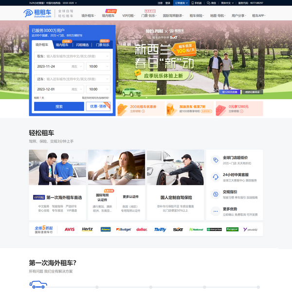 租租車是中國(guó)專業(yè)的全球自駕游平臺(tái),業(yè)務(wù)覆蓋全球近 200 個(gè)國(guó)家和地區(qū)、6000 多個(gè)城市、近 20 萬家門店、800 萬輛好車,為用戶提供境內(nèi)外租車、酒店預(yù)訂、景點(diǎn)門票玩樂預(yù)訂、7x24 小時(shí)全球中英文客服、免費(fèi)中文 GPS、免費(fèi)境外離線地圖、新人閃租、中文取車向?qū)?、保險(xiǎn)等相關(guān)服務(wù)。成立11年以來,租租車已陪伴超過3000萬中國(guó)游客輕松享受全球自駕游。