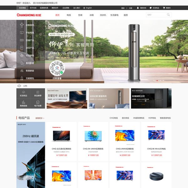 四川長虹電器股份有限公司官方網站,提供智慧家庭智能家電全套解決方案,長虹彩電、空調、熱水器、廚衛(wèi)、手機、日電小家電、新能源、美菱冰箱、美菱洗衣機等***最全產品信息查詢及購買,會員權益,優(yōu)惠活動,購買渠道選擇、網上報裝報修、售后服務等一站式體驗。