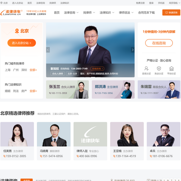找律師、咨詢(xún)律師,上法律快車(chē)。中國(guó)法律服務(wù)平臺(tái)先行者,19年來(lái)為數(shù)千萬(wàn)當(dāng)事人找到適合的本地律師。網(wǎng)站擁有注冊(cè)律師近23萬(wàn),覆蓋刑事、婚姻、合同、勞動(dòng)、房產(chǎn)等80多個(gè)法律專(zhuān)業(yè),在線(xiàn)為您提供免費(fèi)律師咨詢(xún)服務(wù)。