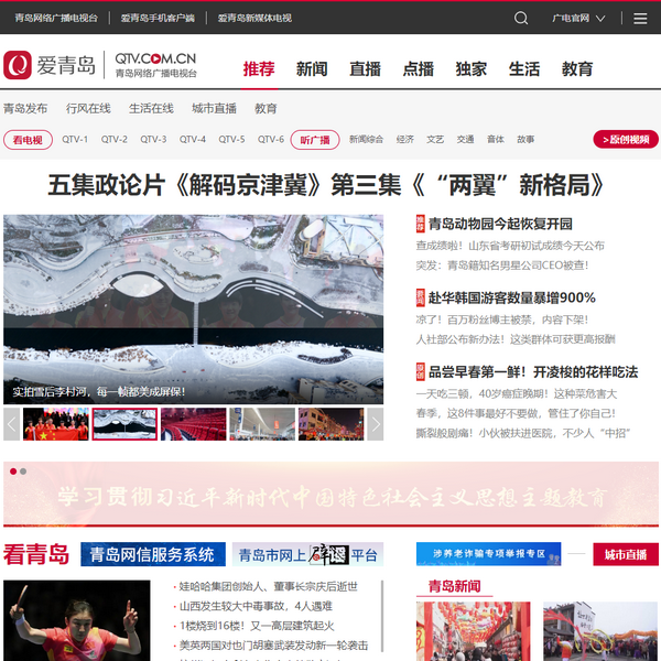 愛青島-青島網(wǎng)絡(luò)廣播電視臺(tái),青島電視臺(tái)官網(wǎng),融合青島傳媒網(wǎng),青島廣播網(wǎng),是青島***視頻門戶網(wǎng)站。提供青島電視臺(tái)、廣播電臺(tái)的在線直播和點(diǎn)播;是《青島新聞》《生活在線》《今日》《夠級(jí)英雄》《一見鐘情》《行風(fēng)在線》等欄目的官網(wǎng);提供青島新聞、青島社區(qū)、青島美食、青島教育、青島旅游、青島天氣、青島公交查詢等綜合信息。