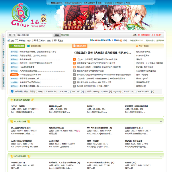 動漫論壇SOSG動漫網(wǎng),中國資深的綜合性大型動漫論壇。提供動漫音樂,動漫壁紙,在線漫畫動畫下載,在線小說等。資訊全面,下載資源豐富,動漫專題版塊論壇眾多,是漫迷交流互動的好平臺。