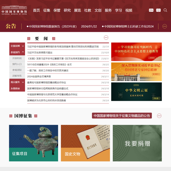 中國國家博物館網(wǎng)站全面及時介紹中國國家博物館概況,藏品,展覽,活動,學(xué)術(shù)研究,國際交流等各項內(nèi)容,提供參觀導(dǎo)覽,門票預(yù)約,留言問答等多類服務(wù),努力為公眾了解國家博物館,參觀國家博物館和享受國家博物館提供的各類文化休閑服務(wù)提供支持。