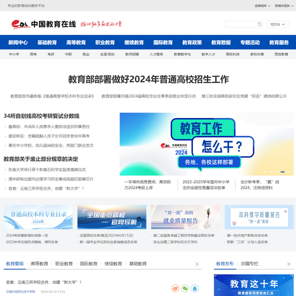 中國教育在線(www.eol.cn)依托CERNET創(chuàng)建于2001年,主要以市場化模式,為社會各界提供各種專業(yè)的教育信息服務。